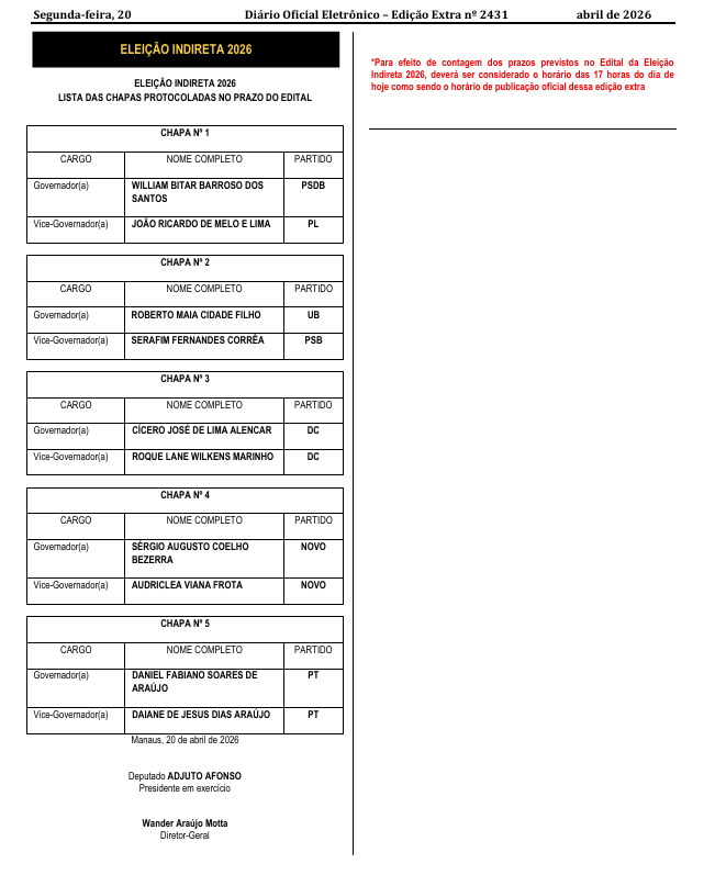 A Assembleia Legislativa do Estado do Amazonas oficializou, nesta segunda-feira (20), as chapas que irão disputar a eleição indireta para o Governo do Amazonas. A confirmação foi publicada em edição extra do Diário Oficial Eletrônico da Casa.